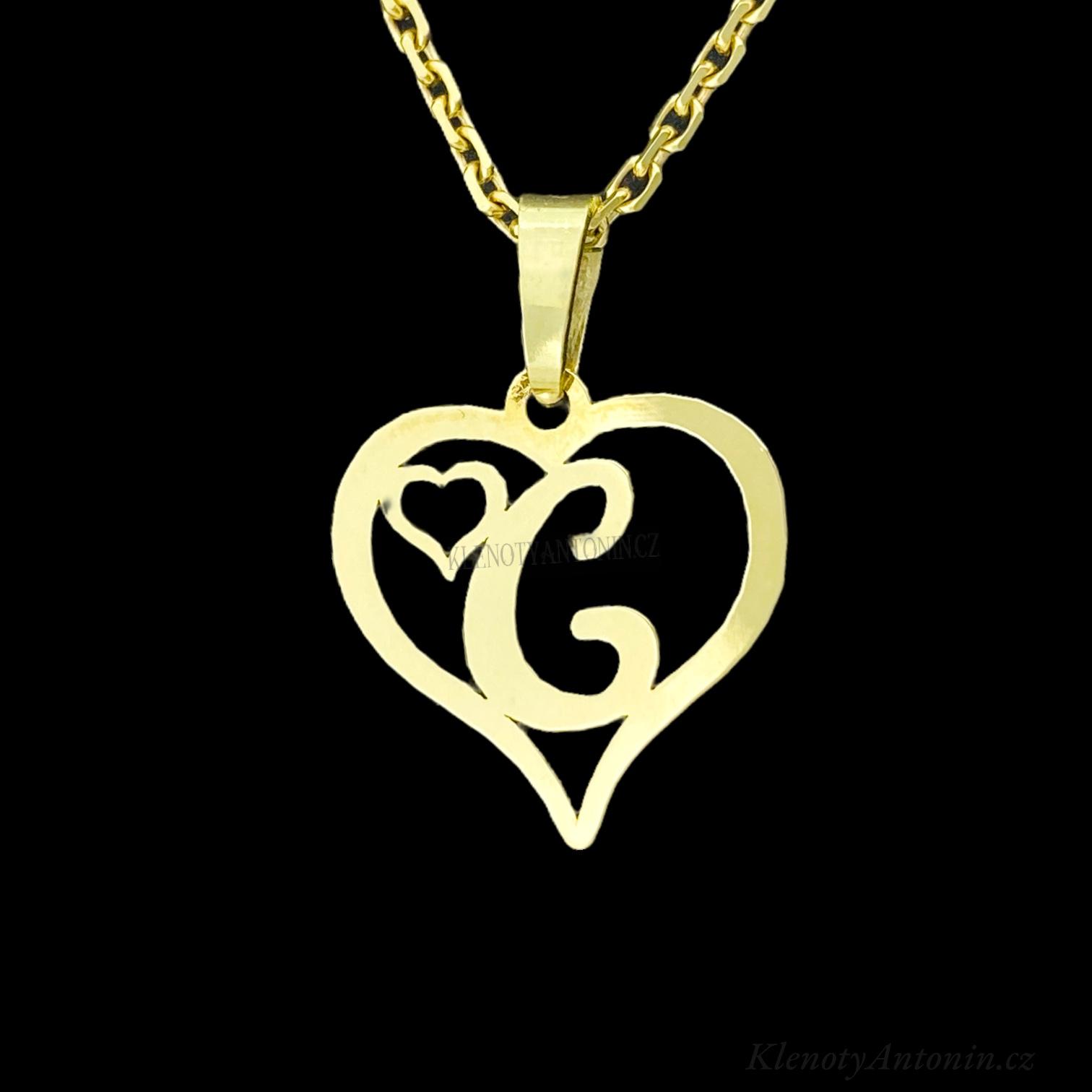 Přívěsek ze žlutého zlata písmeno C v srdíčku. Ryzost šperku Au 585/1000 (14K). Rozměry bez závěsného ouška (14x13.5 mm), hmotnost šperku 0,49g.