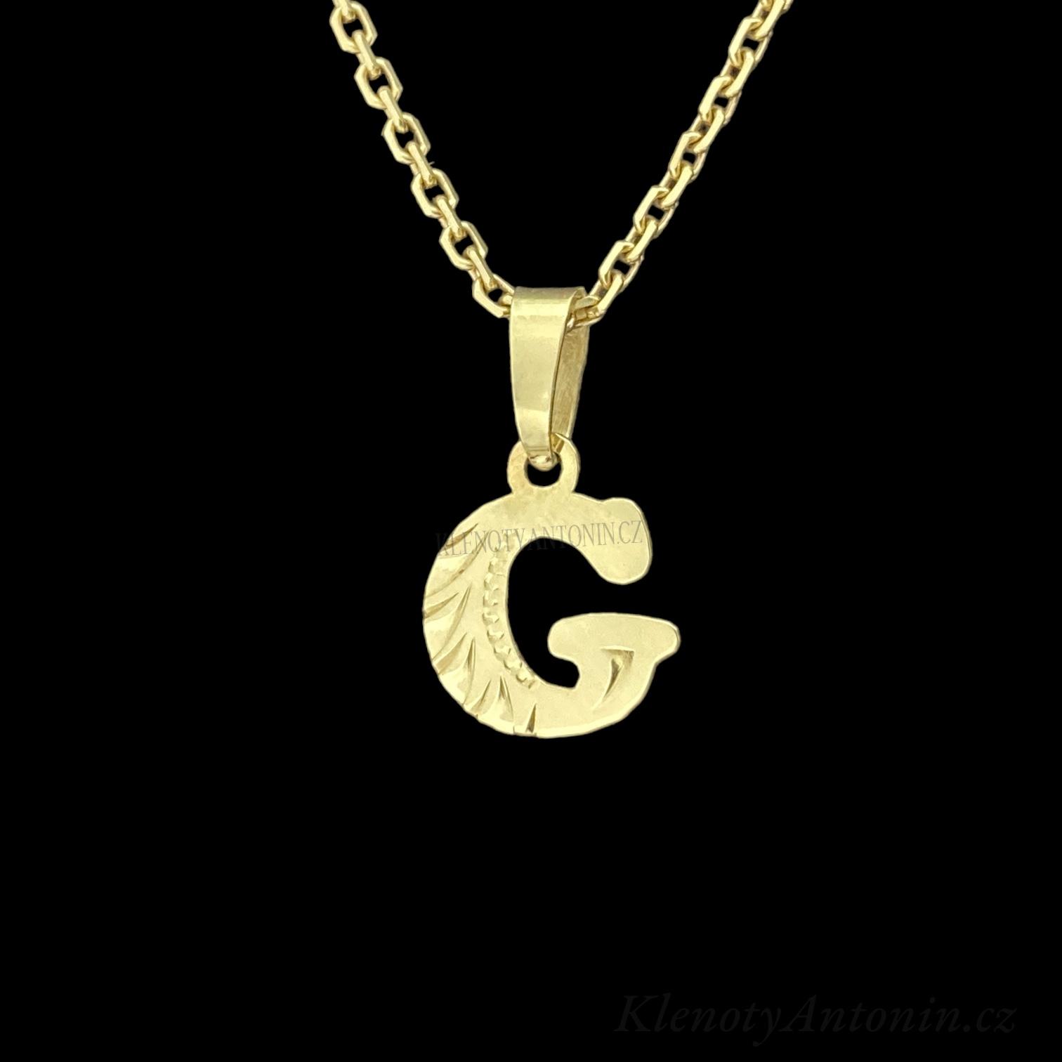 Přívěsek ze žlutého zlata písmeno G. Ryzost šperku Au 585/1000 (14K). Povrch přívěsku je zdoben rytinou, rozměry bez závěsného ouška (10x9 mm), hmotnost šperku 0,35g.