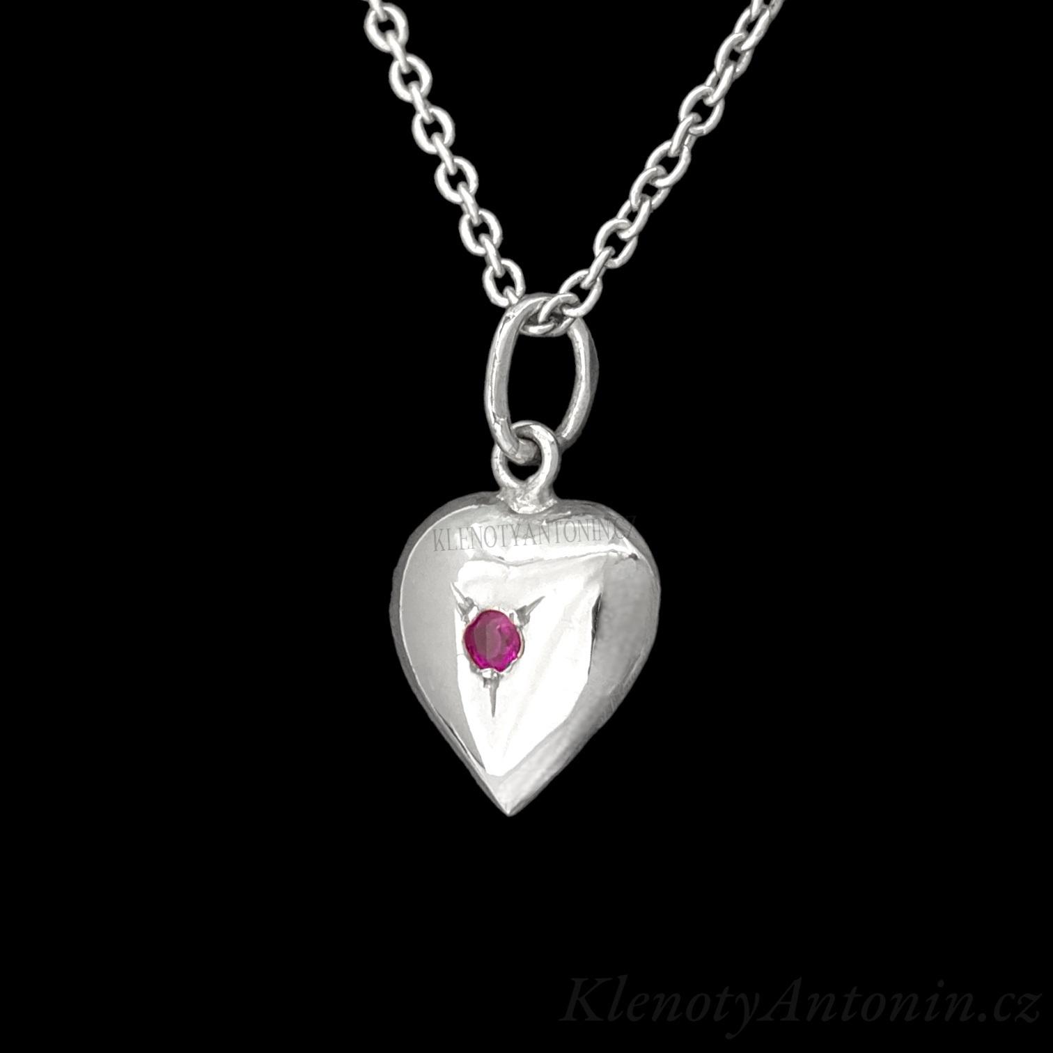Přívěsek srdíčko z bílého zlata s růžovým kamenem. Povrchová úprava šperku (rhodium). Ryzost šperku (Au 585/1000). Rozměry přívěsku bez závěsného ouška (12x10 mm), hmotnost šperku (0,75g).