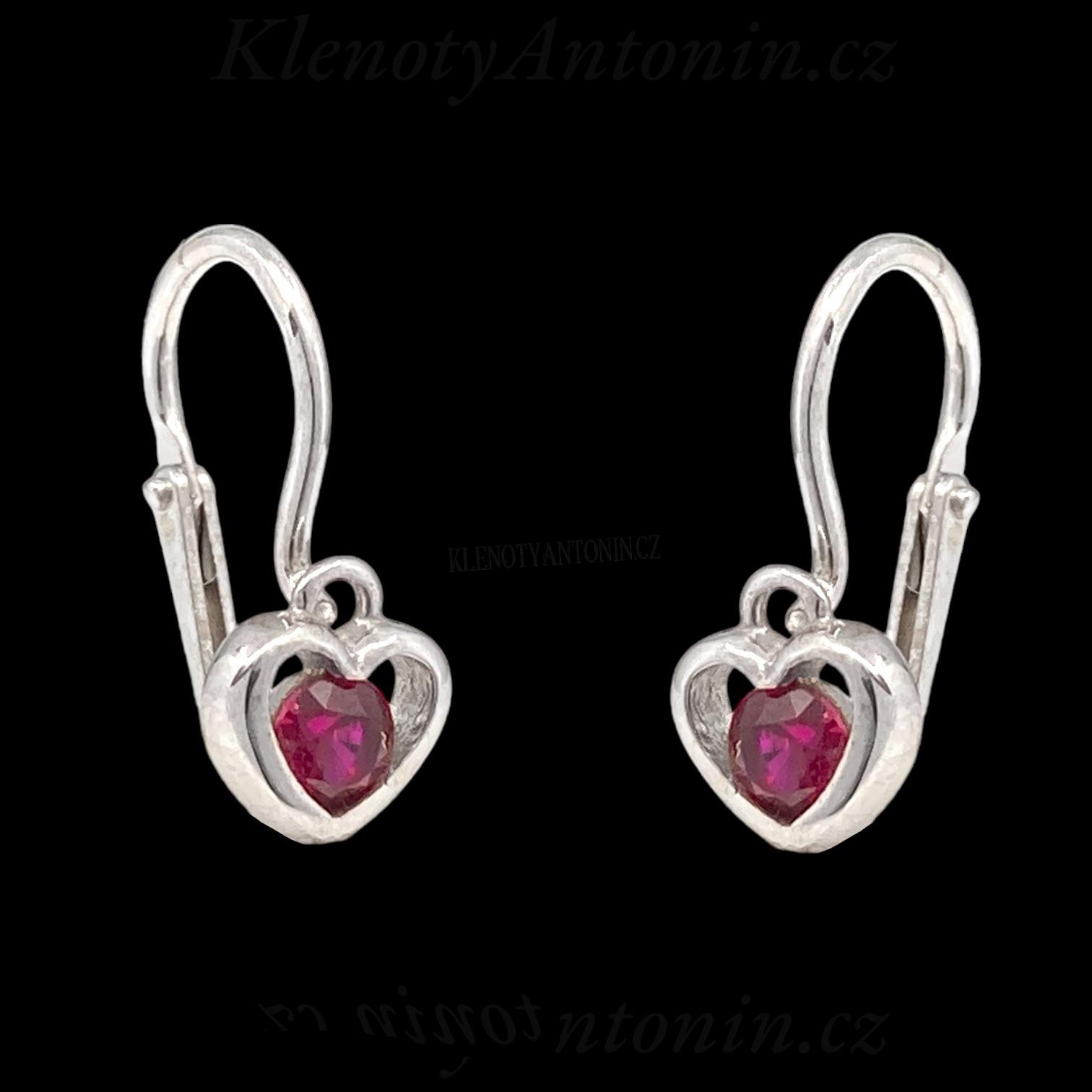 Dětské náušnice srdíčka z bílého zlata s tmavě růžovým kamenem 191885