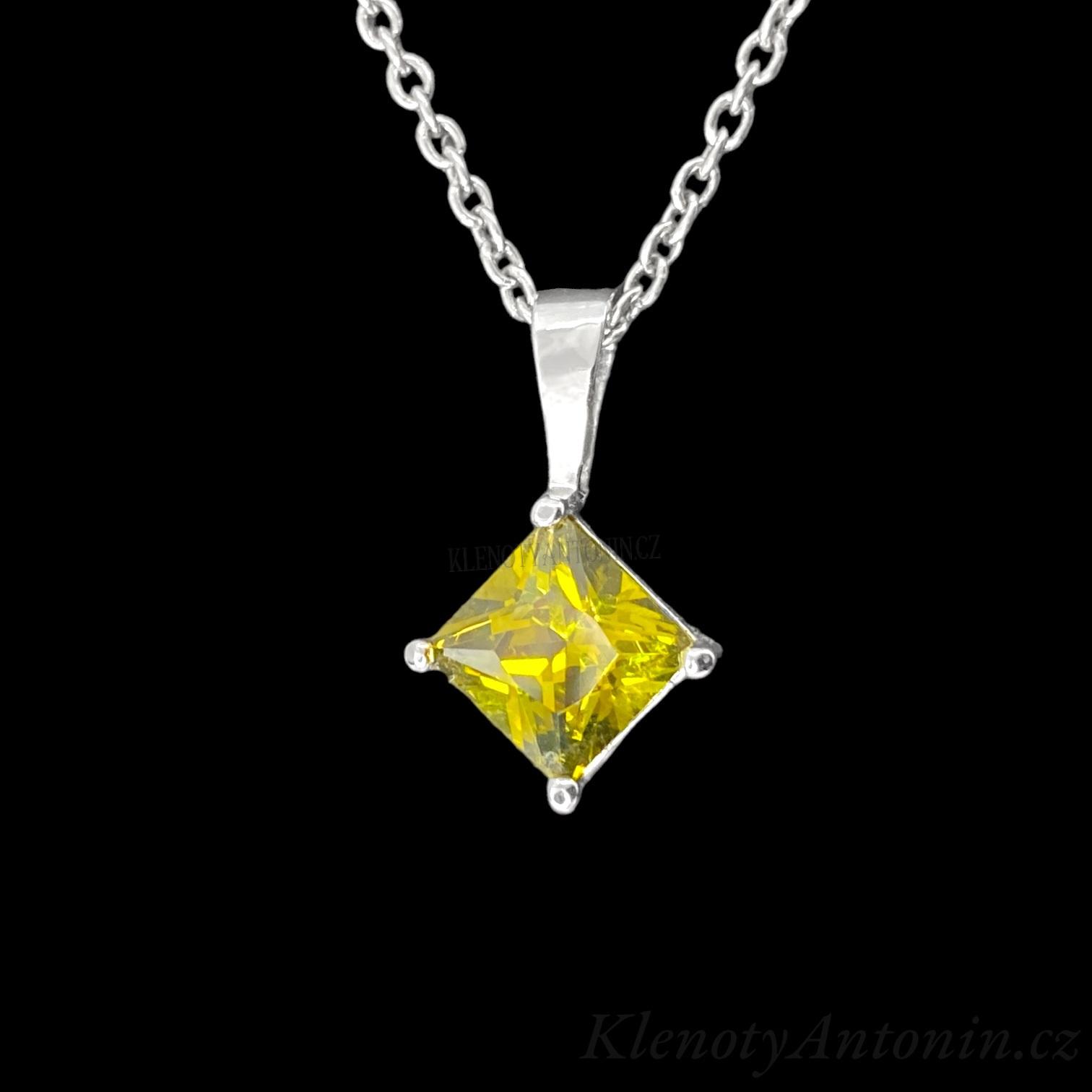 Přívěsek z bílého zlata se žlutozeleným kamenem. Ryzost šperku (Au 585/1000). Rozměry přívěsku bez závěsného ouška (9x9 mm), hmotnost šperku (1,05g). Povrchová úprava (rhodium).