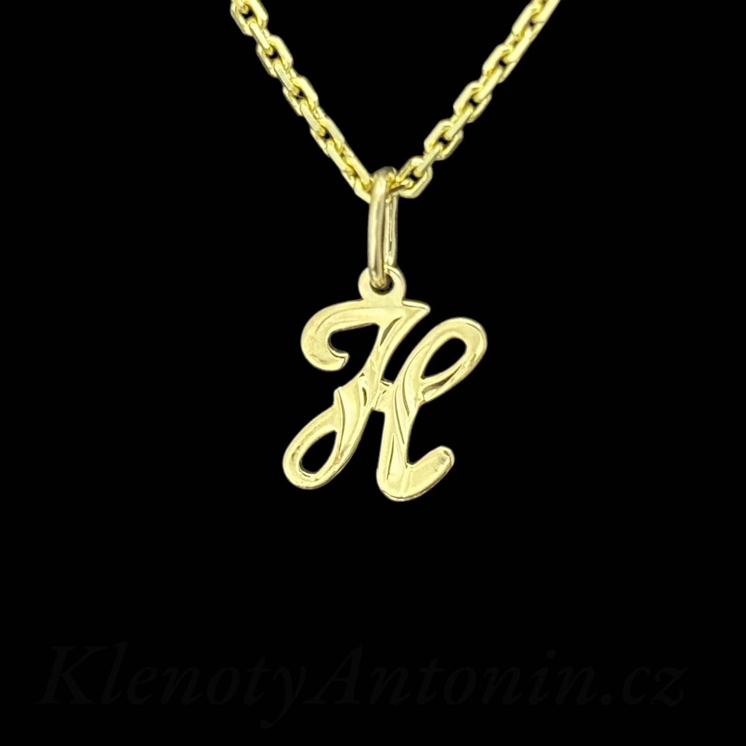 Přívěsek ze žlutého zlata (Au 585/1000) písmeno H. Povrch přívěsku je zdoben rytinou. Rozměry bez závěsného ouška (10,5x7,5 mm), hmotnost šperku (0,30g).
