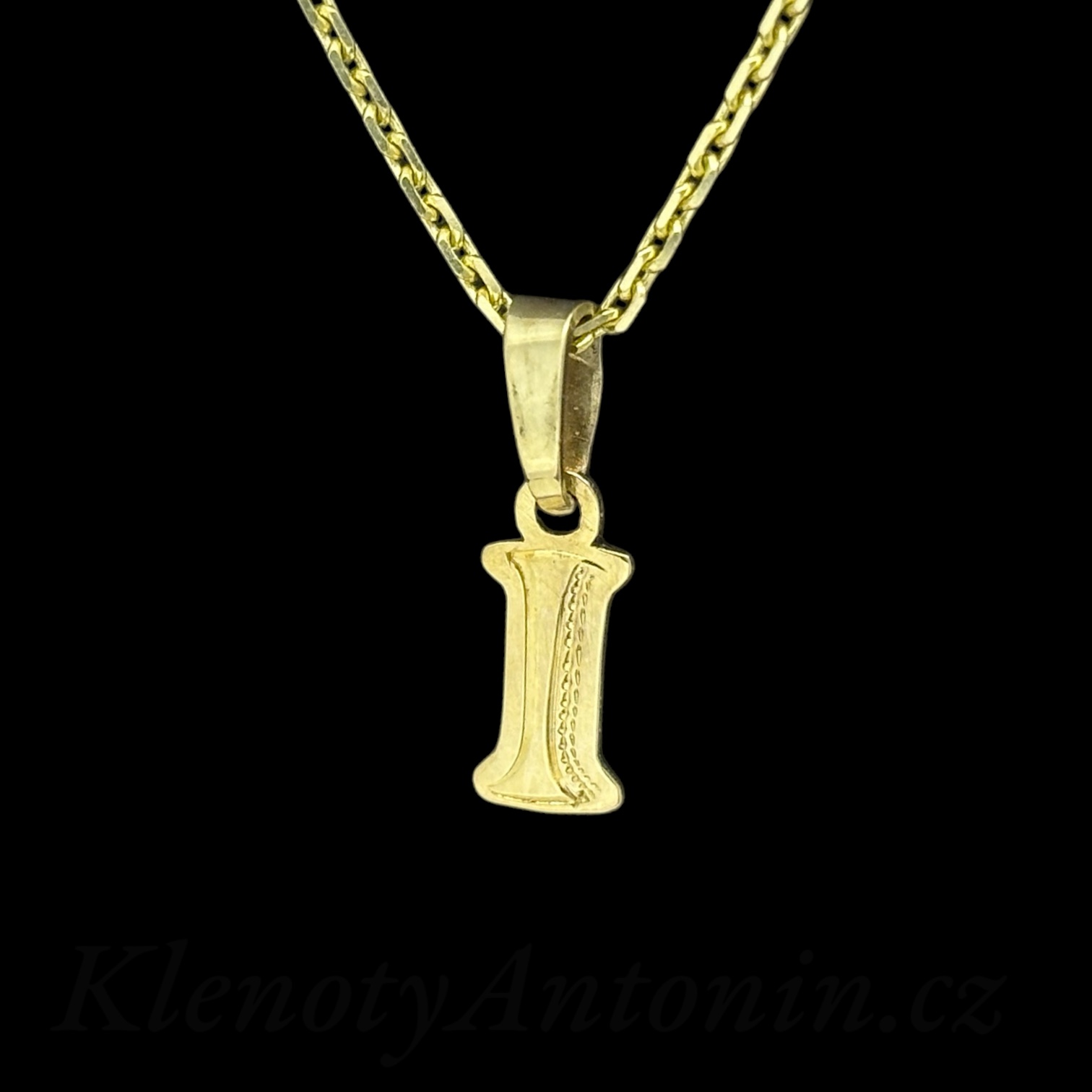 Přívěsek ze žlutého zlata (Au 585/1000) písmeno I. Povrch přívěsku je zdoben rytinou. Rozměry bez závěsného ouška (10x4mm), hmotnost šperku (0,32g).